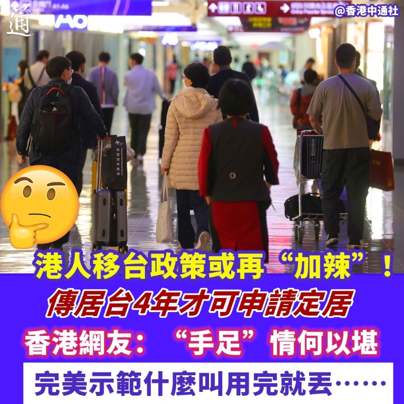 香港新聞網5月3日電 港人移台政策或再“加辣”,被用完即棄的香港“手足”清醒了沒? 據台媒報道,台灣陸委會內部已研議修正“香港澳門居民進入台灣地區及居留定居許可辦法”,將現行港人在台連續居留滿1年可以申請定居的規定,擬修改為至少須居留4年才能申請,比照其他國家或地區人士移台標準。在大陸出生的港人要想定居台灣,則比照“陸配”,居留滿6年才能申請。 報道引述消息稱,因香港情勢複雜,目前的“寬鬆”規定已不合時宜。因此,要補上所謂“國安”漏洞,以防中國大陸藉香港“滲透台灣”。 對此,台陸委會2日回覆台媒查詢時稱,當局尚在整體評估,會在凝聚社會最大共識後,再行推動。 雖然,台灣陸委會未有明確證實相關報道。但消息傳回香港後,已引發網友熱議討論。 “不是說站一起嗎?”有香港網友想起2019年“修例風波”時,蔡英文當局為選票“拉攏”示威者、不斷炒作香港情勢,結果選上後,信了台當局那張嘴的不少香港“手足”卻慘被台灣拒之門外。