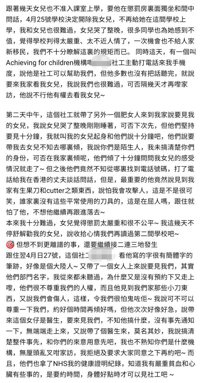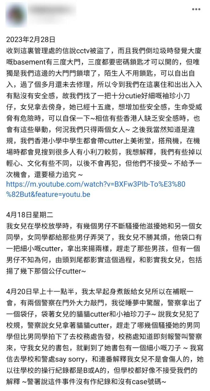 移英網友發帖憶述事件經過。臉書截圖 然而,其女兒的行為被一個男孩全程錄像並告發到學校,不日便有警察找上門來,搜查到她書包裡的小刀。 該網友表示,自己寫信向學校和警署道歉,連番解釋女兒不會傷人,最後警署表示此事不會被記錄在案。但學校卻不接受解釋,甚至在幾天後決定將女兒開除。 “女兒哭了整晚,很多同學也為她感到不值。”該網友認為,香港和英國兩地“文化不同”,自己只是“掉以輕心”且“不太了解這裡的規矩而已”。又控訴英國學校“判得太嚴重、太不近人情了”,即使自己已經保證不會再犯,學校“還要極力追究”,一次機會也不給他們這樣的“新移民”。 糟心的事還不止於此!該網友又說,事後,有社工曾主動表示要提供幫助並上門家訪,卻在看到家裡的刀具後擔心自己會攻擊人。該網友深感冤枉,於是不再讓社工跟進事件。
