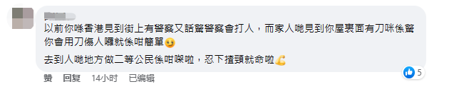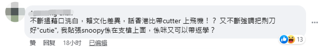 移英網友發帖憶述事件經過。臉書截圖 氣不過的她亦打電話求助英國港僑協會,卻慘遭冷落;另一家社會機構則在傾聽她的遭遇後讓她找律師解決。“搞到這麼麻煩這麼多事,會不會好貴啊?!”該網友生氣地說。 為了顯示自己的“無辜”,該網友還貼出了一位移英網紅在YouTube平台上教大家在家中窗台上放小刀的視頻,顯示自己讓女兒帶刀自衛的想法來自於此。 這則帖文發出後於香港網絡熱傳開來。然而,對於當事人的“叫屈”,不少香港網友卻同情不起來。 在相關消息評論區,有網友諷刺香港“黃絲”“去到別人的地方做二等公民就是這樣的”。 “不斷找藉口‘洗白’,賴文化差異。”還有人一針見血地指,該移英網友不斷強調這把刀好“可愛”,反問若是“貼張Snoopy(卡通形象)在一支槍上面,是不是也可以帶去上學?”