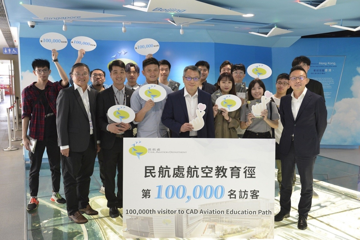 圖片來源:民航處。圖示:民航處處長廖志勇(前排中)、民航處副處長周永恒(前排左一)和署理民航處助理處長(航班事務及安全管理)袁兆基(前排右一)與來自職業訓練局的學生合照。 民航處航空教育徑的第十萬名訪客為來自職業訓練局(職訓局)就讀航空課程的學生。他們除了獲民航處處長廖志勇在航空教育徑親自接待,更獲贈與航空主題有關的紀念品,以慶祝航空教育徑這個重要的里程碑。同學們對於能夠參與並見證這個別具意義的時刻均感到興奮。