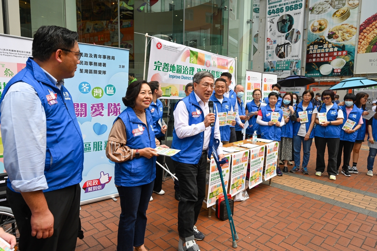 圖片來源:政府新聞網。圖示民政及青年事務局局長麥美娟 其他主禮嘉賓包括民政及青年事務局副局長梁宏正、中央人民政府駐香港特別行政區聯絡辦公室新界工作部部長李薊貽,以及民政事務總署署長張趙凱渝。 誓師典禮前,卓永興和麥美娟到荃灣“關愛隊”的一個宣傳街站,向市民介紹完善地區治理建議方案。而誓師典禮後,麥美娟在區家盛陪同下,視察“關愛隊”為區內居民提供的服務,包括身體檢查和中醫義診服務。