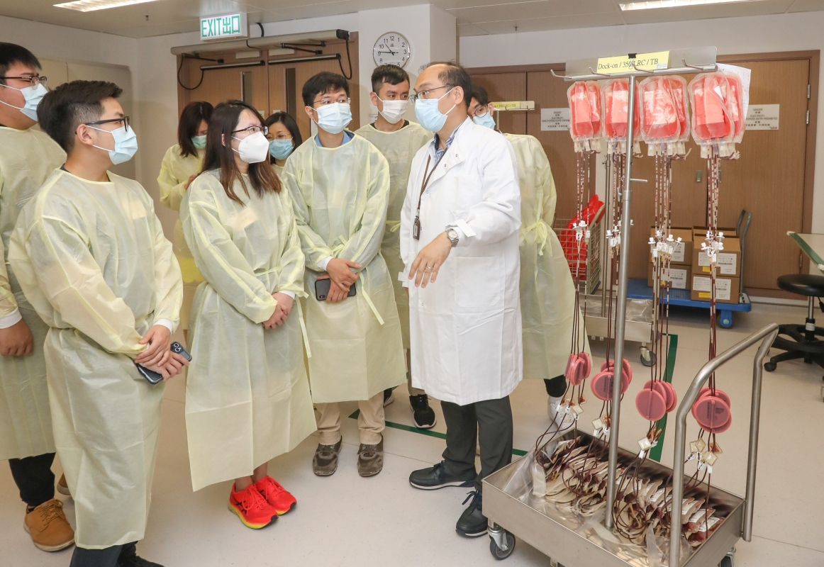 圖片來源:香港醫管局。圖示中心行政及醫務總監李卓廣醫生(右一)帶領青年大使參觀血液成份生產化驗室。