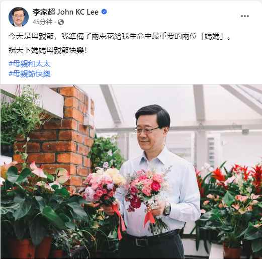 香港新聞網5月14日電 今日(5月14日)是母親節。香港特區行政長官李家超在社交平台發文表示,“今天是母親節,我準備了兩束花給我生命中最重要的兩位‘媽媽’”,分別祝母親和太太節日快樂。同時,“祝天下媽媽母親節快樂!”