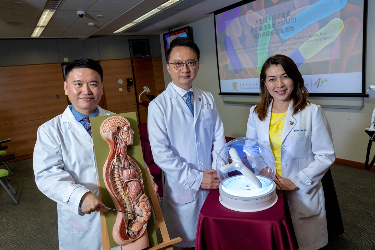 圖片來源:香港中文大學。左起:中大醫學院賽馬會公共衞生及基層醫療學院教授黃至生;中大醫學院院長兼腸道微生物群研究中心主任陳家亮;中大醫學院裘槎醫學科學教授、香港微生物菌群創新中心總監黃秀娟。 以實證醫學 為新冠後遺症患者對症下藥 新冠後遺症是指新冠患者康復後出現持續超過一個月的症狀。中大醫學院賽馬會公共衞生及基層醫療學院教授黃至生表示,新冠後遺症造成廣泛影響,但其徵狀不易分辨。為協助受影響病人解決生理和心理困擾,我們急需要具規模的臨床研究以找出對策。 中大醫學院早前的研究指出,腸道微生態與新冠後遺症息息相關,然而沒有證據顯示一般益生菌可以舒緩新冠後遺症問題。中大醫學院研究團隊利用大數據及機器學習,發明了SIM01微生態配方,並以微膠囊鎖活菌技術(microencapsulation)製成口服配方。 最近團隊完成名為RECOVERY的大型三盲、隨機兼有安慰劑對照的臨床研究,旨在評估中大研發的SIM01配方能否改善不同系統及器官的新冠後遺症徵狀。 團隊在2021至2022年共招募463名新冠康復者參與研究,參加者平均年齡為49歲,當中女性佔65.4%,約七成是於2022年確診的Omicron個案。參加者被隨機分成SIM01組及對照組,兩組人數各佔約一半,前者服用SIM01配方六個月,而後者則服用含有維他命C的安慰劑六個月。 服用SIM01配方的參加者中 有更多人的消化系統和神經系統徵狀得到改善 結果,研究證實服用SIM01配方六個月後,五類新冠後遺症徵狀的改善率比對照組明顯較高,包括腸胃問題、疲倦、難以集中精神、記憶力問題及整體不舒服。除了臨床評估外,研究團隊同時以宏基因組學(Metagenomics)比較SIM01組及對照組糞便樣本,以分析他們腸道微生態的改變。 團隊發現,SIM01組的腸道益菌數量及微生物多樣性明顯提升,亦同時降低了腸道惡菌的數量,顯示SIM01具有調整腸道微生態的功效。 中大醫學院裘槎醫學科學教授、香港微生物菌群創新中心總監黃秀娟指出,這是全球首項臨床研究證明SIM01能透過改善腸道微生態舒緩新冠後遺症徵狀,包括集中力及記憶力等問題。這些發現證明了“菌—腸—腦軸”的重要性,腦功能可透過傳遞腸道益菌的代謝物至大腦而得以改善,亦反映重整健康腸道微生態可成為改善腦神經相關新冠後遺症徵狀的新策略。 中大醫學院院長兼腸道微生物群研究中心主任陳家亮總結,由傳統益生菌發展成微生態配方,需要大量臨床數據、宏基因組學分析及微膠囊鎖活菌技術。(完) 【編輯:崔靜雯】