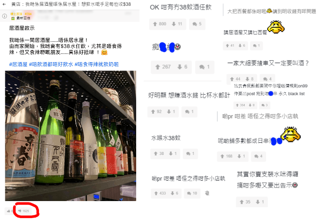 “黃店”賬號於“連登”討論區發帖遭“手足”集體批鬥 該“黃店”稱,從現在開始,將推出“38元(港幣,下同)水任飲”的消費項目,暗示今後不會再免費提供飲用水給食客,更陰陽怪氣地說,這對於那些不太能吃辣但又要點辣味食物、最後不得不大量喝水的朋友,“真是好抵(值得)”。 在帖文最後,該“黃店”還加上了“不飲酒都不好飲水”“吃不了辣就喝奶啦”等標籤,極力表達對到店後不點任何付費飲品的食客的不滿。 “黃店”的有關帖文被同路人截圖並發布至連登討論區後,顯然激怒了一眾“手足”。據查,店家的有關言論在討論區內僅獲不到百人點讚,卻獲上千“手足”點下與“讚”相反的“踩帖”鍵。 在討論區內,有“手足”抱怨,店家“搞這麼多還要出告示”,還不如直接賣瓶裝水。 “那有沒有38元酒任飲?”也有人不滿店家吃相難看、連“給杯水都計較”,回懟道。 還有人反問,難道一家人開車去居酒屋吃飯也一定要喝酒嗎? 有人就批評店家公關維護得太差,並由此聯想到其他貪心不足的“黃店”,諷刺說“難怪有這麼多小店執(倒閉)”。 遭“手足”集體批鬥後,該黃店又氣急敗壞地在社交平台臉書發帖表示,“原來這麼多人覺得去居酒屋只喝水是沒問題的”,感慨自己一點都不懂“香港文化”。
