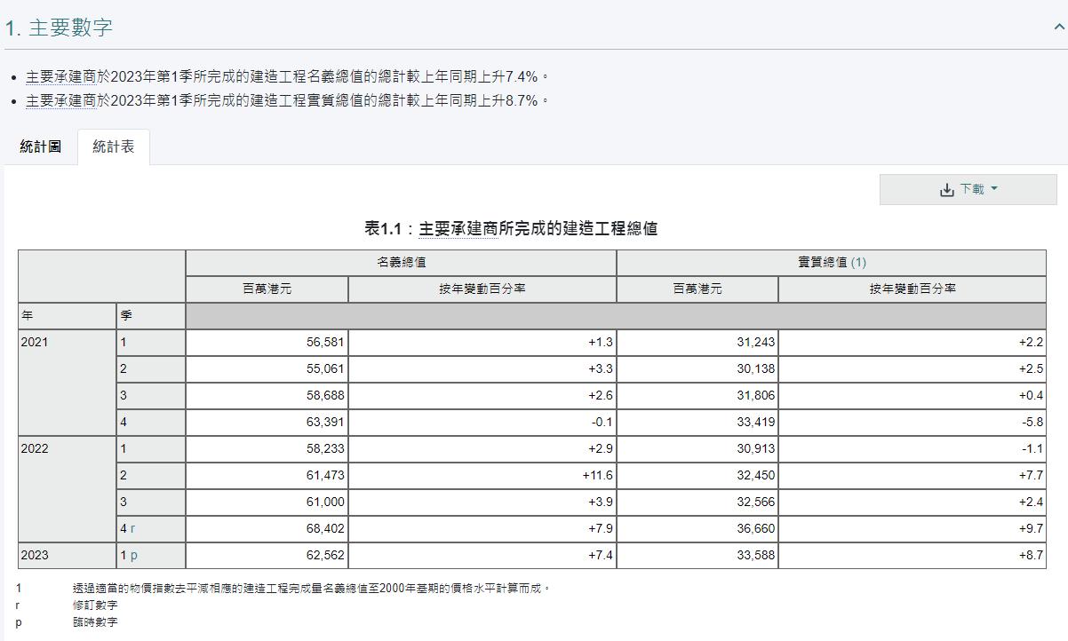 香港特區政府統計處数据截图 據公佈,剔除價格變動的影響後,主要承建商所完成的建造工程總值的總計於同期升8.7%。 按建造工程類別分析,於2023年第一季完成的私人地盤建造工程,名義總值為170億元,較去年同期升18.2%。以實質計算,升幅為17.9%。於2023年第一季完成的公營地盤建造工程名義總值,較上年同期輕微上升0.5%至235億元。以實質計算,升幅為1.5%。 按主要用途類別分析,住宅樓宇建造工程於2023年第一季完成的地盤建造工程,名義總值為125億元,較去年同期升16.4%。同期間,運輸工程於2023年第一季完成的地盤建造工程名義總值上升32.4%至101億元。 以經季節性調整的數字按季比較,主要承建商於2023年第一季完成的建造工程名義總值較2022年第四季上升3%。以實質計算,升幅為3.6%。(完) 【編輯:凌玉辉】