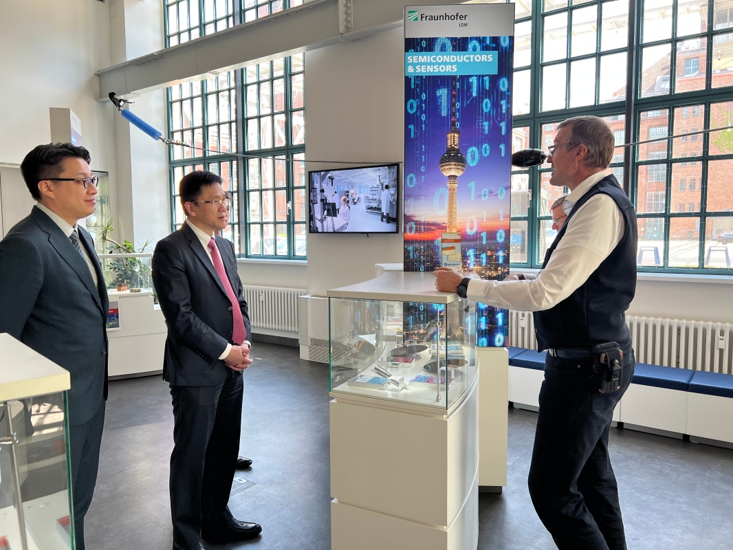 圖片來源:香港政府新聞處。圖示孫東在2023年亞洲柏林峰會參觀來自不同創新網絡和機構、科學平台及初創孵化器設立的展位。 孫東下午與德國微電子研究院代表會面,了解德國電子微米和納米研究的最新發展。該研究院是歐洲其中一個最大的跨地點研發合作網絡,具有弗勞恩霍夫協會和萊布尼茲協會轄下13個研究所的專業知識,專注於基礎研究和產品發展的銜接,以及就創新解決方案提供技術專長。