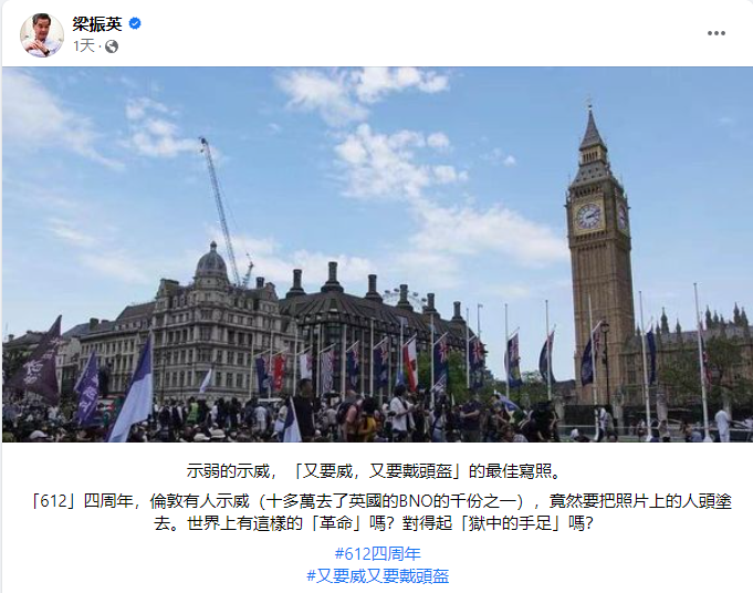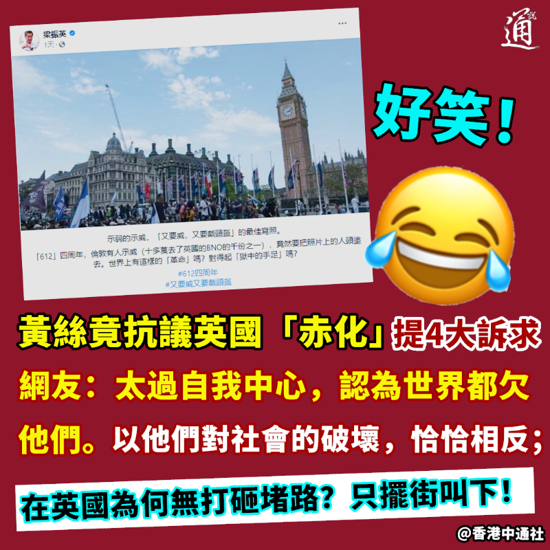 (截圖自梁振英社交平台) 香港前特首梁振英近日也在社交平台貼出有關集會照片,提到所謂“612”四周年,倫敦有人示威,但竟然“要把照片上的人頭塗去”。 又要威又要戴頭盔!梁振英諷刺“世界上有這樣的‘革命’嗎?對得起獄中的手足嗎?”認為這屬“示弱的示威。” 香港網友亦紛紛在評論區嘲笑這些不敢光明正大參與集會的人是“無膽匪類”。 就在英“黃絲”提出的所謂“四大訴求”,有網友感嘆,他們“太過自我中心,認為全世界都欠了他們。以他們對社會的破壞,是恰恰相反。”