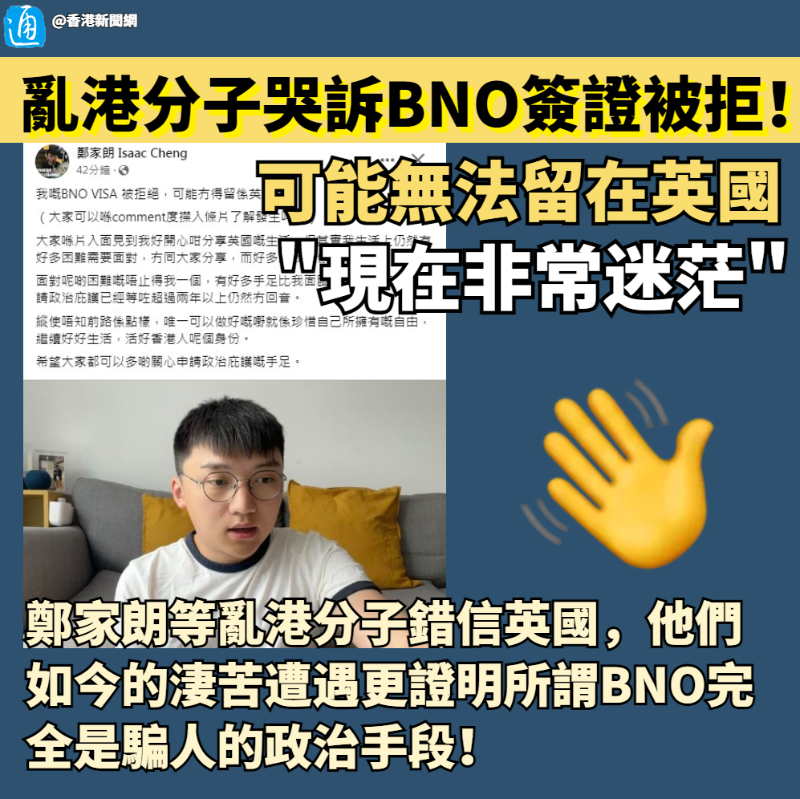 香港新聞網7月4日電 亂港之後竄逃英國,卻發現無法獲得合法簽證,在英生活舉步維艱? 竄逃英國的前“香港眾志”副主席鄭家朗昨日(3日)在社交平台發文並上載短片,哀歎自己BNO簽證被拒絕,可能無法留在英國。 鄭家朗透露,去年英國公布1997年後出生的合資格港人可獨立申請BNO簽證的計劃後,他就立刻去申請,但三個月之內都未獲回覆。之後突然有一天,收到英國政府的電郵,對方稱他的BNO簽證不獲批准。 早前,英國政府曾鼓勵“手足”之流由“政治庇護”轉為申請BNO簽證,但鄭家朗指,實際上申請“政治庇護”之時不可以同時申請BNO簽證,但若取消“政治庇護”申請就會變“逾期居留”,照樣不可以申請BNO簽證。 無計可施之下,鄭家朗只好找律師幫忙,看“政治庇護”的申請能否加快,但沒想到法援也被拒絕了。他哭訴本想待簽證塵埃落定後便出來工作,結果現在非常迷茫,不確定將來留在英國的前景。又指其實很多在英“手足”都面臨同樣的困境。