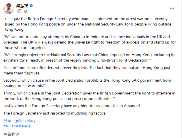 梁振英三問駁斥英政客。臉書截圖 對於克萊弗利聲稱香港國安法及其域外管轄權違反具有法律約束力的《中英聯合聲明》,梁振英提出詰問:“《中英聯合聲明》中哪一條禁止香港特區政府發出逮捕令?”“《中英聯合聲明》哪一條賦予英國政府干涉香港警方和檢控機關工作的權利?” “最後,外交大臣對(正於倫敦被監禁的揭密網站“維基解密”創辦人)阿桑奇有什麼要說的嗎?”梁振英接著問道。 他批評克萊弗利此番是採取了抹黑技倆。 現年52歲的阿桑奇, 2010年透過“維基解密”公開大量美國政府機密文件,包括與阿富汗及伊拉克戰爭相關的國防檔案,涉及18項罪名被通緝。他一度長期於厄瓜多爾駐英使館尋求庇護。至2019年在獲得厄瓜多爾使館容許下,英國警方入內將阿桑奇拘捕。其後美國政府向英國尋求引渡,英國法院認為美國承諾會人道對待他,決定批出引渡,阿桑奇不服上訴,可英國最高法院早前駁回其上訴申請。 梁振英此篇一針見血的駁斥帖文一出,很快引起廣泛關注。 在該帖文及相關轉帖的評論區,不少香港網友紛紛“點讚”,對梁振英有關言論表示讚同。