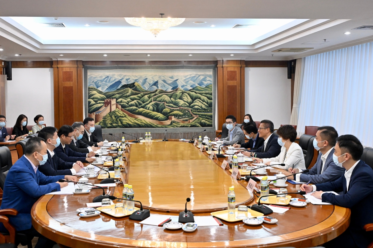 陳茂波(右四)與國家發展和改革委員會副主任叢亮(左三)會面。 早上,陳茂波與國家發展和改革委員會副主任叢亮會面。陳茂波在會上介紹香港在金融、經濟、創科等領域的最新情況,雙方也就“十四五”規劃中給香港“八大中心”定位的建設進展、推動粵港澳大灣區經濟更深度融合,以及香港助力“一帶一路”建設進行了深入交流。