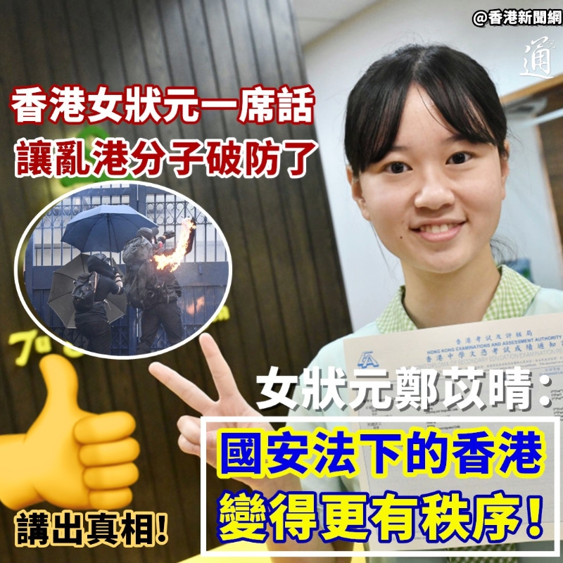 (香港新聞網製圖) 因此,鄭苡晴的一番言論於香港網絡流傳後,亦引發不少網友點贊附和。 有網友感嘆,香港狀元的一席話狠狠打臉了整日唱衰中國的外國反華勢力及亂港分子!也有香港網友直指,這才叫有為青年。 翻查資料,去年香港中學文憑試放榜,來自喇沙書院的狀元張殷碩也曾提到,國安法實施後,令社會紛爭及政黨間的爭鬥減少,香港變得安定。 紫荊研究院早前公布的民調結果亦顯示,逾七成半市民對香港國安法實施成效感到滿意。另外,82.6%受訪者認為,同香港國安法實施之前相比,香港社會秩序和治安狀況變好;有76.2%受訪者認為,基本法賦予香港居民的自由權利未受影響。 【編輯:刘春】