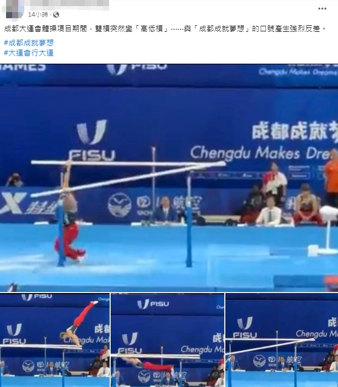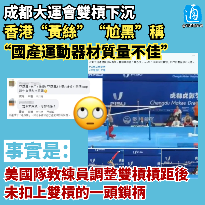 (香港新聞網製圖) “‘雙槓’突然變‘高低槓’……”在社交平台臉書上,一位已經移居英國的香港“黃絲”發帖陰陽怪氣道,此事故“與‘成都成就夢想’的口號產生強烈反差”,試圖內涵大運會器材設施有質量問題。