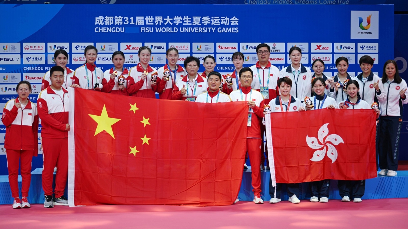 香港新聞網8月3日電 香港代表隊在成都世界大學生運動會乒乓混雙項目奪得一面銅牌,杜凱琹和何鈞傑於準決賽直落四局敗給國家隊組合王曉彤和薛飛,無緣晉級,賽事不設銅牌賽。最終國家隊以3至2擊敗日本隊摘得金牌,韓國隊和中國香港隊獲得銅牌。五星紅旗在成都體育中心冉冉升起。賽後進行隆重的頒獎儀式環節,國乒特意邀請香港女隊合影留念。