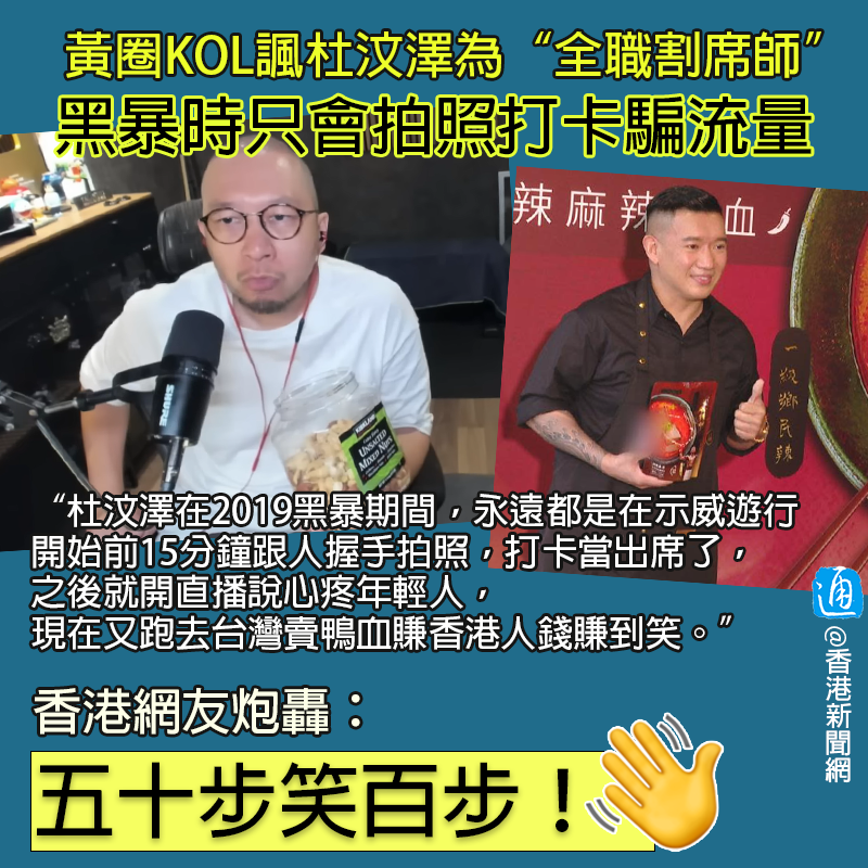 香港新聞網8月4日電 曾說好“齊上齊落”的香港“黃絲”又內訌“互毆”?近日,一名移居日本的“黃絲”KOL就將炮火對準昔日的“手足”、離港赴台的杜汶澤,炮轟對方借黑暴騙流量賺錢。 移居日本、號稱香港“黃圈第一YouTuber”的“大J”近期在遊戲直播時談到微辣前經理人阿晶離世事件。由於阿晶生前曾打下千字文,疑指控微辣員工集體欺凌,不少品牌相繼與微辣“割席”。 直播中,“大J”提到越來越多人與微辣“割席”時,有網友提到“港獨”藝人杜汶澤早前亦疑似“割席”微辣,“大J”隨即吐槽杜汶澤是“全職割席師”——“阿布泰他割席,現在微辣,他又割席,還有什麼人他未割席”? “大J”還嘲諷杜汶澤眼光毒辣,但凡合作過的人都是“需要割席之流”。 接著,“大J”火力全開,吐槽杜汶澤在2019黑暴期間,永遠都是在示威遊行開始前15分鐘跟人握手拍照,打卡當出席了,之後就開直播說心疼年輕人,現在又跑去台灣賣鴨血賺香港人錢賺到笑。