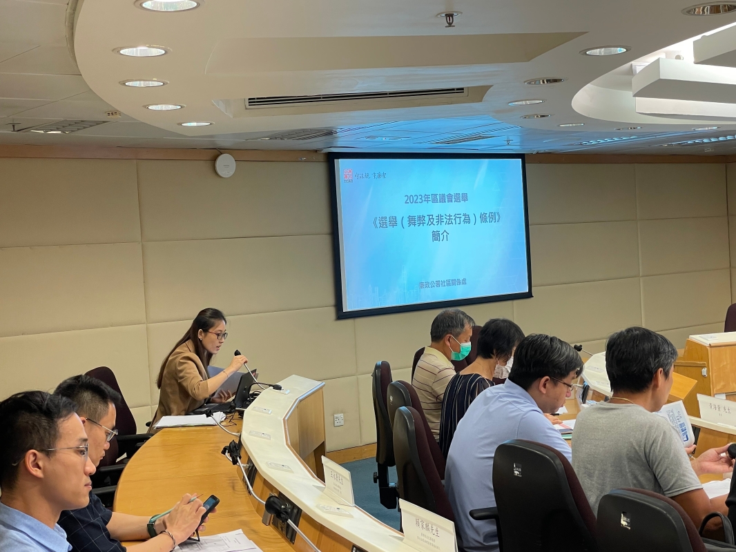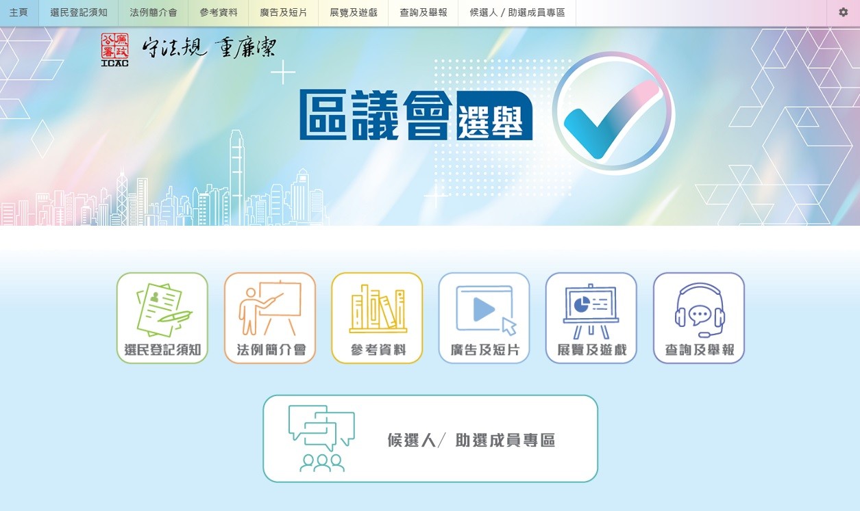 图片來源:廉政公署 宣傳教育工作 廉署已全面開展一系列以“守法規 重廉潔”為主題的教育及宣傳項目,加強選舉持份者,包括候選人、助選人士及選民對法例的認識,以及呼籲市民大眾與廉署共同維護廉潔選舉文化。主要項目包括: (i) 安排法例簡介會 廉署會出席全港18區超過100場撲滅罪行委員會、防火委員會及分區委員會會議,向委員講解《選舉(舞弊及非法行為)條例》(《選舉條例》)的規定,亦要注意避免干犯《防止賄賂條例》或其他相關罪行。 廉署亦會為政黨及政治團體安排法例簡介會,提醒有意參選人士和助選人員進行選舉工程時須留意的地方,並於香港島、九龍及新界區舉辦三場簡介會,供地區團體、樓宇管理組織及市民大眾參加。
