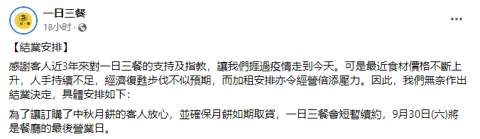 香港新聞網8月10日電 這家香港知名“黃店”也要關門了? 香港前立法會議員譚文豪有份開設的茶餐廳“一日三餐”昨日(9日)在社交媒體宣布,因食材價格不斷上升、人手持續不足,以及加租令經營倍添壓力,無奈作出結業決定。指餐廳最後營業日為9月30日,歡迎有意接手人士洽談。 當晚,“一日三餐”在其臉書專頁發文,稱感謝客人過去三年的支持和指教,讓餐廳能挨過疫情,但最近食材價格不斷上升,人手持續不足,加租安排亦令經營倍添壓力,故無奈作出結業決定。