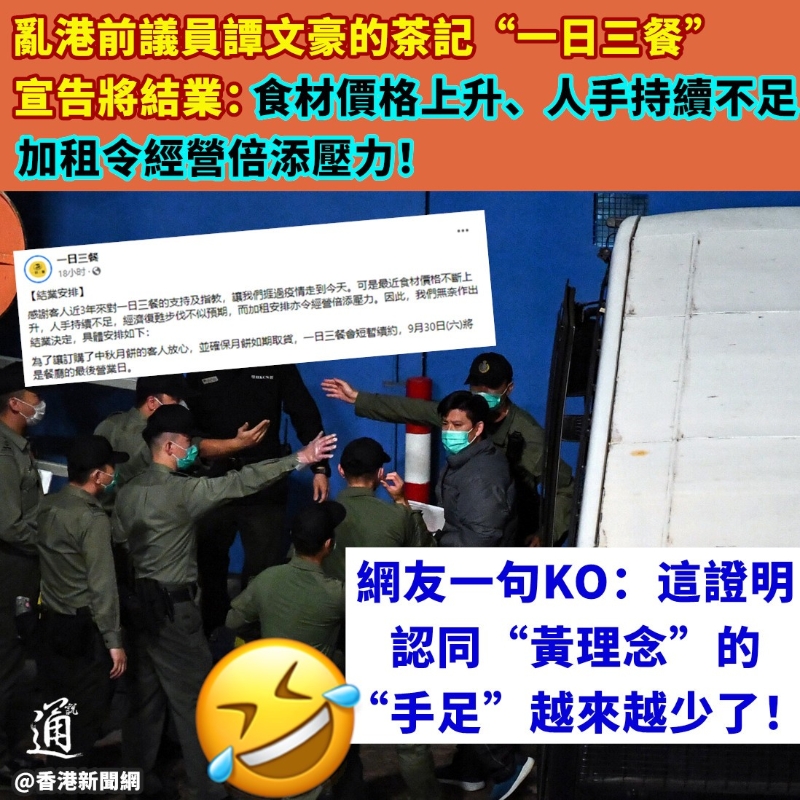 但“一日三餐”強調,為讓訂購了中秋月餅的客人放心,並確保月餅如期取貨,會短暫續約,9月30日將是餐廳的最後營業日。又稱若有人“有意洽談頂手”,歡迎聯絡。 “一日三餐”的老闆之一為前亂港議員譚文豪。他於2001年至2019年擔任飛機師一職,期間在2016 年參選香港立法會並成功當選。 2019年香港發生“修例風波”後,當年7月26日,身為飛機師的譚文豪在一架從日本東京飛往香港的航空班機內,通過機艙廣播“聲援”亂港分子。他還曾出面阻止警方執法。 2019年7月14日,譚文豪在沙田混亂場合中“指指點點”,還扮演“人牆”角色阻擾警方執法,更要求與現場警察指揮官溝通。同年8月22日,近千名亂港激進分子參與所謂“中學生反修例集會”,企圖煽動學生罷課。譚文豪亦在集會現場鼓勵示威者向身邊的親朋好友、特別是支持政府的人“宣教”,爭取支持所謂“訴求”。 離任立法會後,譚文豪與前公民黨黨友林瑞華於2020年12月在旺角通菜街合夥開設茶餐廳“一日三餐”。開業之初,立法會前議員張超雄、梁繼昌、毛孟靜、楊岳橋等還到場撐場,譚文豪也不時到店內協助送貨等。 不過其後,譚文豪因涉香港非法“初選案”,被捕還押至今。 據悉,“一日三餐”原本月租8萬元(港幣,下同),租約在今年年中期滿。其後,業主大幅加租25%,“一日三餐”遂以10萬元續租鋪位。 豈料,沒過幾個月,“一日三餐”便撐不下去了,“黃色經濟圈”內又一家“黃店”宣告結業。 “修例風波”發生後,“黃絲”曾大搞所謂“黃絲經濟圈”,呼籲“手足”只去“黃店”消費,惟現實是,一家接一家“黃店”關門,現在連“黃名在外”的前“黃絲”議員開設的茶餐廳也免不了結業的命運。