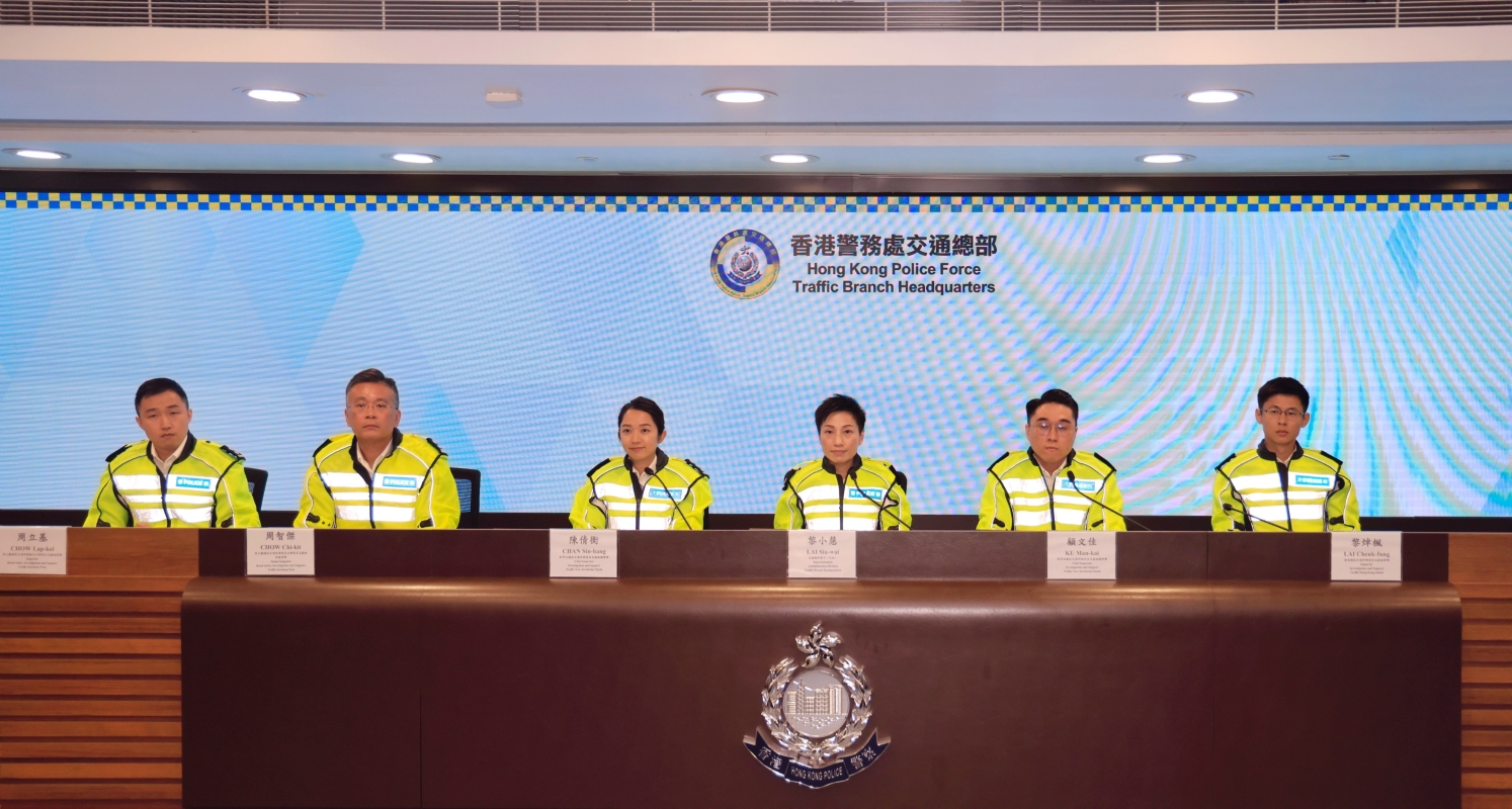 交通總部警司(行政)黎小慧(右三)、新界北總區交通部調查及支援組總督察陳倩衡(左三)及新界南總區交通部調查及支援組總督察顧文佳(右二)等出席記者會。