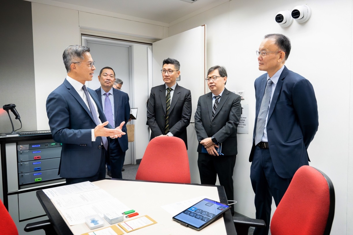 香港新聞網9月11日電 新加坡警察部隊總監雲維德及代表團今日(11日)到訪香港廉政公署,除與署理廉政專員丘樹春及其他廉署領導人員交流不同的工作策略外,還參觀了廉署第三代錄影會面室。第三代錄影會面室除了以USB手指儲存會面錄影檔以延長其儲存壽命外,還在天花板設有高清鏡頭,鏡頭可以在錄影會面時同步錄影枱頭的文件及智能電話等,避免日後上法庭時的爭拗。 據悉,廉署於1991年正式引入錄影會面室,是香港首個執法機構推行以錄影會面與受疑人進行會談,確保受疑人在客觀透明的情況下接受會見。錄影會面室設有三角形枱、隔音牆及弧形鏡,天花設有錄音裝置,會面室內的攝錄機可以清楚攝錄到廉署人員、受疑人及其律師的面部表情及放置枱上的物件,體現廉署重視法治精神和確保程序公義。
