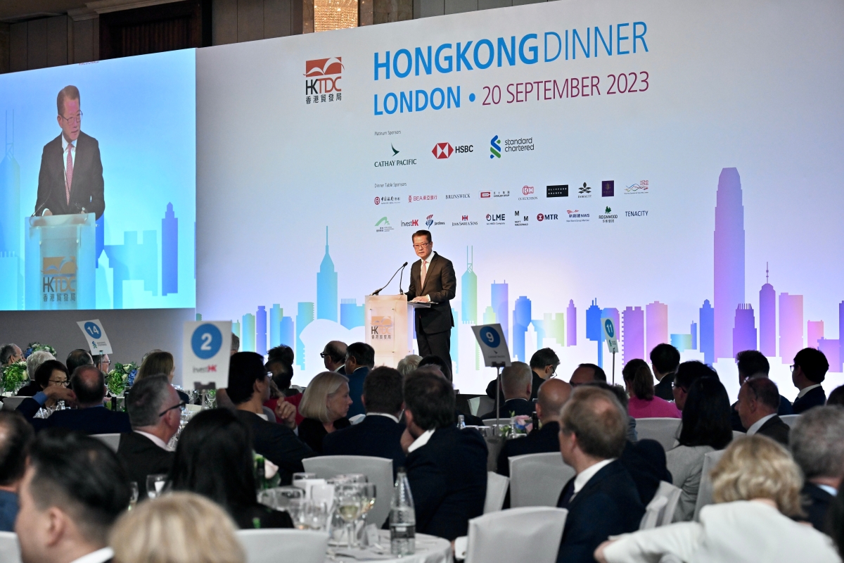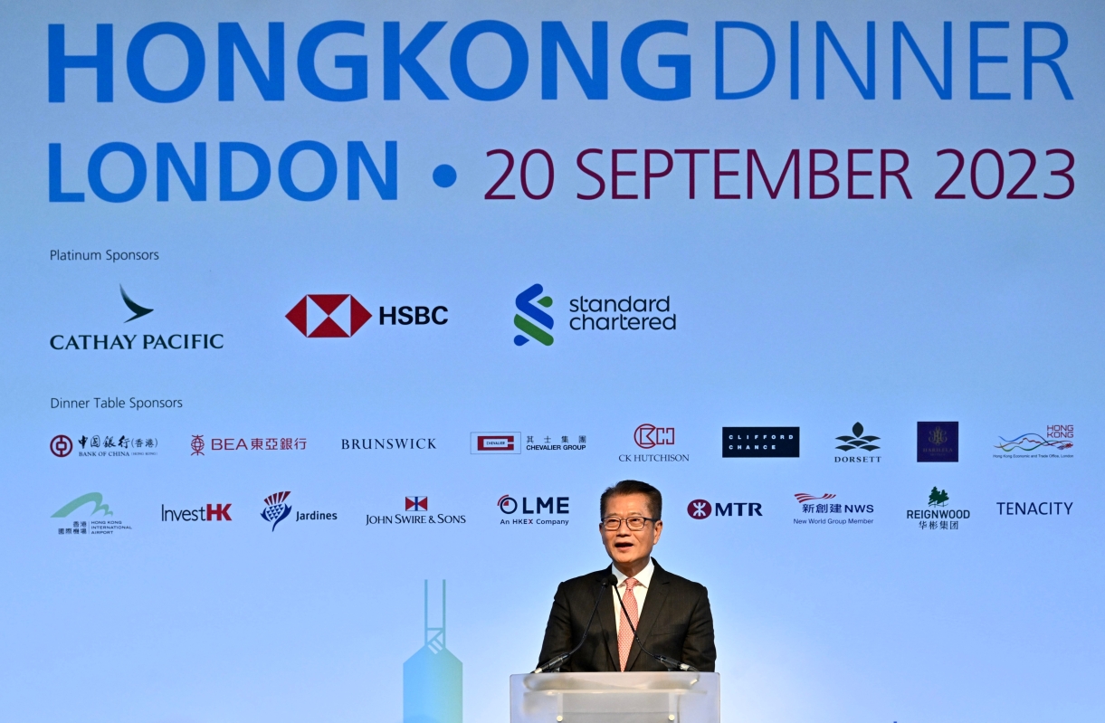陳茂波在晚宴上發表主題演講。 陳茂波抵達倫敦後,晚上出席了香港貿易發展局舉辦的“香港晚宴”,晚宴邀得約400名英國各界領袖和專業人士出席。陳茂波在致辭時向在場的英國政商界人士指出,香港現已全面擺脫疫情、跟國際及內地全面通關,社會經濟正穩步恢復,各項大型活動、會議和盛事陸續在港舉辦。國家支持香港長期實施“一國兩制”制度,香港將會繼續發揮著連通内地和世界的獨特角色和功能。