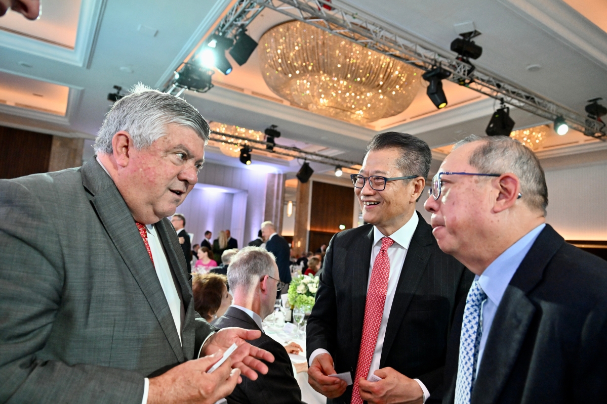 陳茂波(右二)和香港貿易發展局主席林建岳博士(右一)與參與晚宴的嘉賓交流。 陳茂波指出,展望未來,在國家的堅實支持下,香港將積極鞏固和提升國際金融中心地位,增強證券市場、債券市場、資產管理中心,以及離岸人民幣業務樞紐等範疇的競爭力和吸引力;同時全力推動創科發展,積極跟粵港澳大灣區兄弟城市加強合作,並透過更多政策創新,共同推進北部都會區發展成為創科中心,尤其在綠色科技和綠色金融方面大有可為。