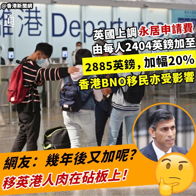 鑒於持BNO簽證移英的港人在英國居留5年後,需申請永久居留,因此亦受加價影響。 另外,其他簽證費用亦有調整,包括投資者簽證從1638英鎊(約15783港元)加至1884英鎊(約18153港元);從境外申請的學生簽證由363英鎊(約3497港元)加至490英鎊(約4721港元)等。 “肉在砧板上。”有香港網友於有關消息的評論區發出靈魂拷問:“幾年後又加呢”? 的確,面對英國不斷上調的各類移民費用,移英港人能撐到何時? “英國多個城巿破產,只有打港人主意。”也有部分網友感嘆,透過英國政府一系列的“騷操作”,可想而知,他們有多窮!