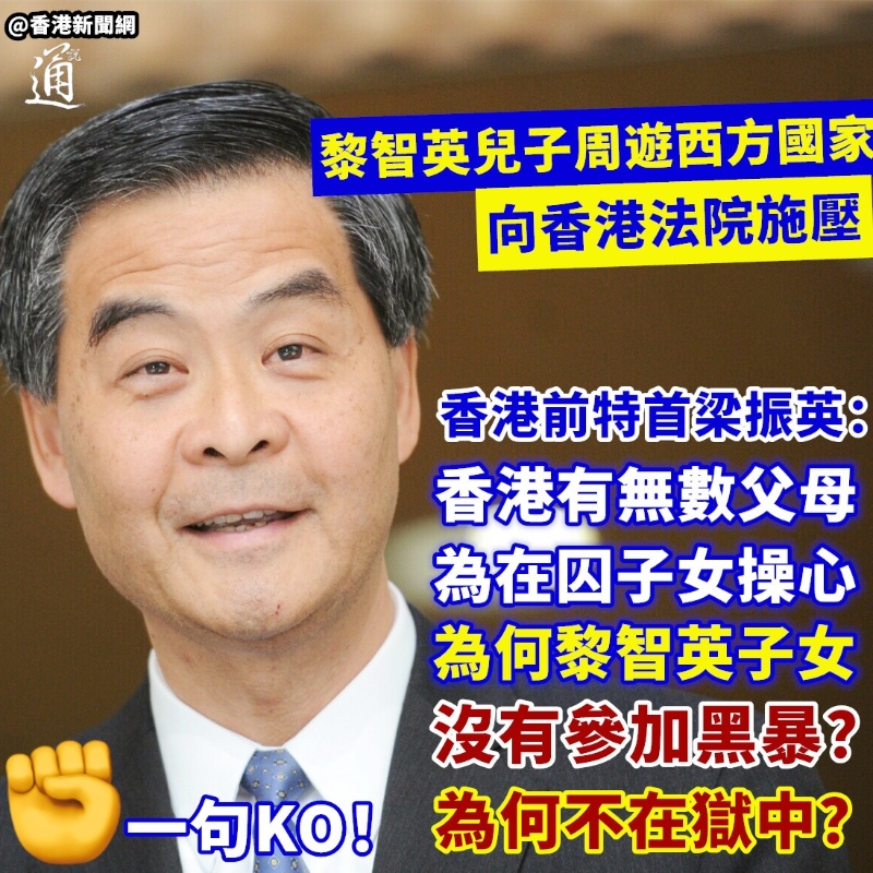 香港新聞網9月28日電 壹傳媒創辦人黎智英涉嫌違反香港國安法,以及其他案件被判監,至今被關押獄中。黎智英兒子黎崇恩日前周遊西方國家,妄圖向香港法院施壓。對此,香港前特首梁振英近日在社交平台發文,直指“香港有無數父母每天為在囚的年輕子女操心,白頭人哭黑頭人。為什麼黎智英眾多的年輕子女沒有參加黑暴?為什麼不在獄中?” “為什麼一個都沒有?”梁振英認為,“如果黎智英為每一個被判刑和逃離香港的年輕黑暴分子坐牢一天,(被關押)一千日算什麼?”