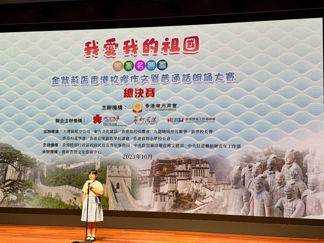 第二屆“我愛我的祖國”普通話朗誦大賽圓滿舉行香港新聞網10月7日電 (記者 陳卓儀)由香港潮州商會主辦,香港大公文匯傳媒集團、藝術香港、香港教育工作者聯會聯合主辦; 香港特別行政區政府民政及青年事務局、中央駐港聯絡辦宣文部,青年工作部擔任支持機構,大灣區航空公司、東方文化雜誌、香港島校長聯會、九龍地域校長聯會、新界校長會、香港校董學會、香港直接資助學校議會、香港資助小學校長會協辦,大公報、文匯報、中國日報香港版、香港中通社、中新社香港分社、香港商報、東方文化雜誌、點新聞、鏡報、羊城晚報報業集團香港記者站、瞭望新時代雜誌社、香港新聞工作者聯會擔任媒體支持機構的“我愛我的祖國”(風景名勝篇)—香港校際作文暨普通話朗誦大賽總決賽暨頒獎典禮,於10月7日在香港故宮文化博物館隆重舉行。 經過多次比賽選拔,總決賽現場菁英雲集,各位同學熱情高漲,個個摩拳擦掌,拿出自己最好的狀態,衝刺獎牌。