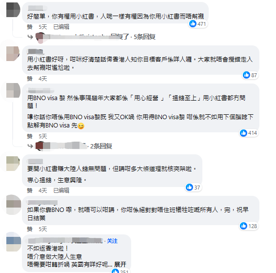 臉書截圖 對於近期有不少朋友關心自己就此事的看法,“麥太”承認自家店鋪有Instagram和小紅書賬戶,還貼出了店鋪的小紅書賬號主頁截圖。她自稱只是一個喜歡分享美食的婦女,經營一間小壽司店,不認同用內地社交平台作宣傳推廣,就要被“同路人”視為“死罪”,“如果用不被喜歡的平台來宣傳及歡迎不同國籍的客人就被標籤,絕對是網絡欺凌,抹煞所有人的努力!” “麥太”表示,自己跟師傅兩家一共八口人來到英國重新生活,努力創業開一間餐廳不容易,只想用心經營,踏實生活,又向“同路人”強調其店鋪“招聘的同事都是移英港人”。 文章末尾,“麥太”又打上“在自由的社會不再被文字獄批鬥”的標籤,重申立場,並附上“大家努力生活做個有水準的香港人”的標籤,疑向移英港人喊話“求饒”。 然而,“麥太”的一番“真情剖白”,未能說服部分“黃到盡”的香港BNO移民。 在該帖文評論區,有政治上腦的移英港人不依不饒地說,“既然你選擇用小紅書,麻煩你不好自稱真香港人”,“好簡單,你有權用小紅書,人們一樣有權因為你用小紅書而不幫襯”。 “不如回香港啦!”也有“同路人”諷刺稱,“用小紅書就賣(在內地受歡迎的)小龍蝦。”他們宣判用小紅書即是向內地“跪低”,甚至將移英港人商家使用小紅書的行為喚作“為虎作倀”,宣稱這是“為該平台提供內容及相應流量、觀看時間、行為數據……” 還有移英港人對“麥太”用小紅書一事表現“憤慨”,聲稱“你用BNO簽證來(英國),就不如先用個腦想下為何有BNO簽證?”認為其不知對英國感恩,反而為內地社交平台“貢獻流量”。