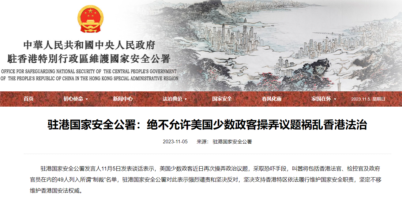 香港中通社11月5日電 駐港國家安全公署發言人11月5日發表談話表示,美國少數政客近日再次操弄政治議題,採取恐嚇手段,叫囂將包括香港法官、檢控官及政府官員在內的49人列入所謂“制裁”名單,駐港國家安全公署對此表示強烈譴責和堅決反對,堅決支持香港特區依法履行維護國家安全職責,堅定不移維護香港國安法權威。