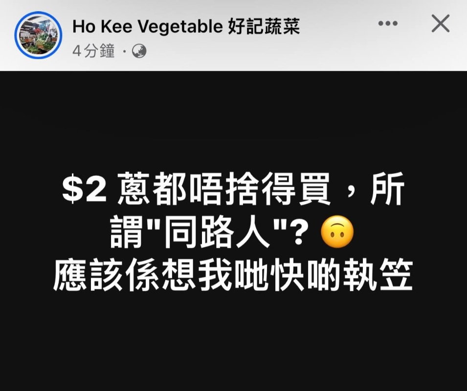 網友評論 看到光榮冰室情急之下“亂咬”的樣子,有網友回憶起,該店當年“狙擊”另一間“黃店”龍門冰室的時候還十分“威勢”,揶揄這些“黃店”“內鬥最強,執笠(倒閉)了就只知道賣慘。 除“黃店”餐廳外,在網絡上宣洩不滿的還有“黃菜檔”“好記蔬菜”。 該菜檔直接將矛盾對準昔日“戰友”,在帖文中抱怨“2港元的蔥都不捨得買,所謂‘同路人’?”