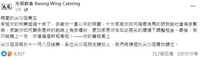 (香港新聞網製圖) 近日,“黃店”光榮冰室在社交平台臉書發帖,宣布其尖沙咀店鋪於11月8日結業,但他們會繼續在該區域尋找新址。