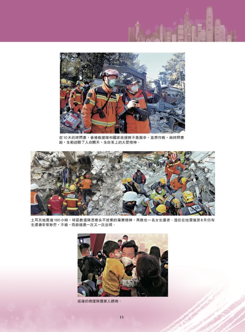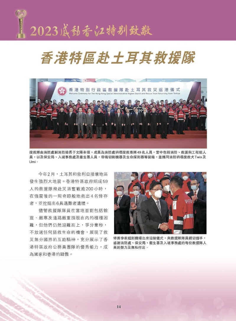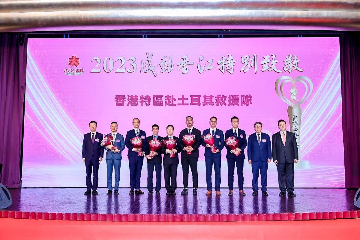 圖片來源:主辦方。 “2023感動香江特別致敬” 今年2月,土耳其和敘利亞接壤地區發生強烈大地震,香港特區政府組成59人的救援隊飛赴災區奮戰逾200小時,在強震後的一周奇跡般地救出4名倖存者,並挖掘出6具遇難者遺體。他們迎難而上,爭分奪秒,不放過任何拯救生命的機會,充分展現了救災無分國界的互助精神,展示了香港特區政府公務員團隊的優秀能力,是國家和香港的驕傲。 “2023感動香江團體”
