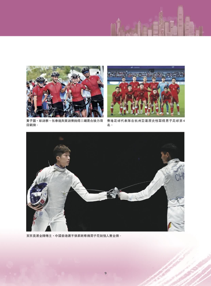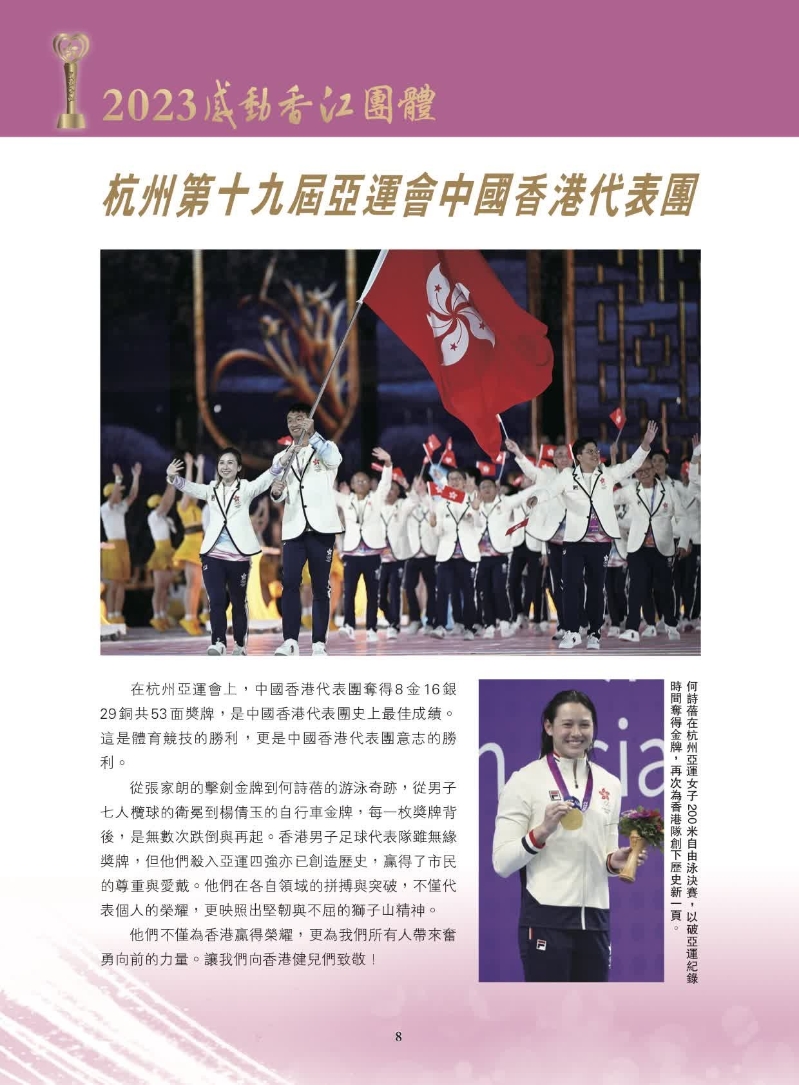 圖片來源:主辦方。 杭州第19屆亞洲運動會中國香港代表團,在杭州亞運會上,中國香港代表團奪得8金16銀29銅共53面獎牌,是中國香港代表團史上最佳成績。這是體育競技的勝利,更是中國香港代表團意志的勝利。