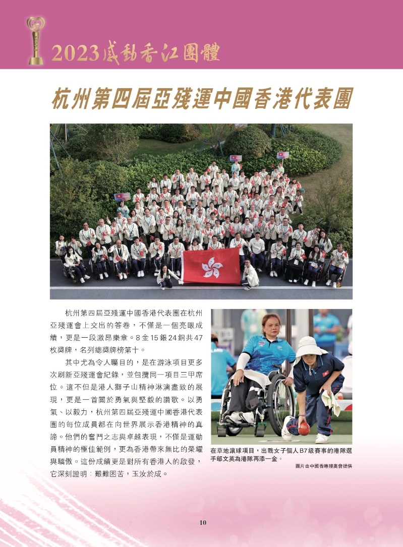 圖片來源:主辦方。 杭州第4屆亞洲殘疾人運動會中國香港代表團,杭州第四屆亞殘運中國香港代表團在亞殘運會上交出的答卷,不僅是一份亮眼的成績單,更是一段激昂的樂章。8金15銀24銅共47枚獎牌,名列總獎牌榜第十。