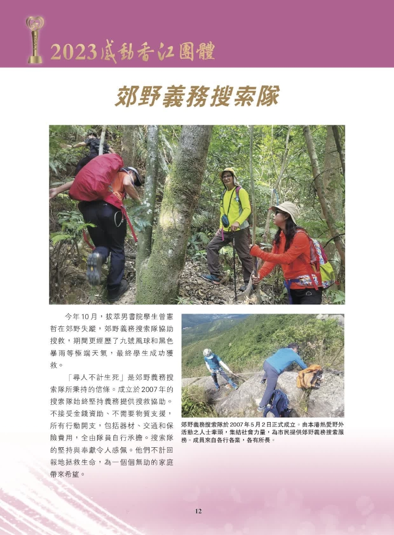 圖片來源:主辦方。 郊野義務搜索隊,今年10月,拔萃男書院學生曾憲哲在郊野失蹤,郊野義務搜索隊協助搜救,期間更經歷了九號風球和黑色暴雨等極端天氣,最終學生成功獲救,他們不計回報地拯救生命,為一個個無助的家庭帶來希望。此外,香港特區赴土耳其救援隊獲頒發“2023感動香江特別致敬”獎。(完) 【編輯:崔靜雯】