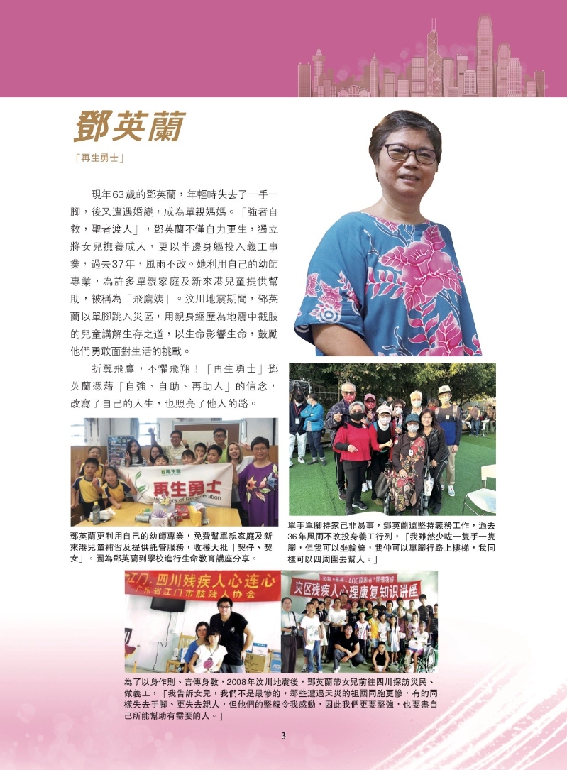 圖片來源:主辦方。 “再生勇士”鄧英蘭,現年63歲的鄧英蘭年輕時失去了一手一腳,後又成為單親媽媽,“強者自救,聖者渡人”,鄧英蘭不僅自力更生,獨立將女兒撫養成人,更以半邊身軀投入義工事業。