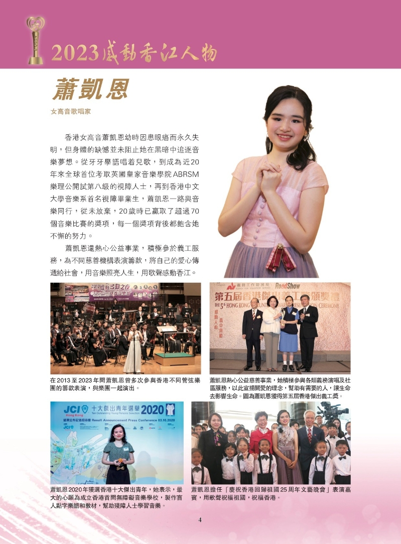 圖片來源:主辦方。 女高音歌唱家蕭凱恩,她幼時因病永久失明,但身體的缺憾並未阻止她在黑暗中追逐音樂夢想,20歲時已贏取了超過70個音樂比賽的獎項,她還熱心公益事業,積極參與義務工作,用音樂照亮人生,用歌聲感動香江。
