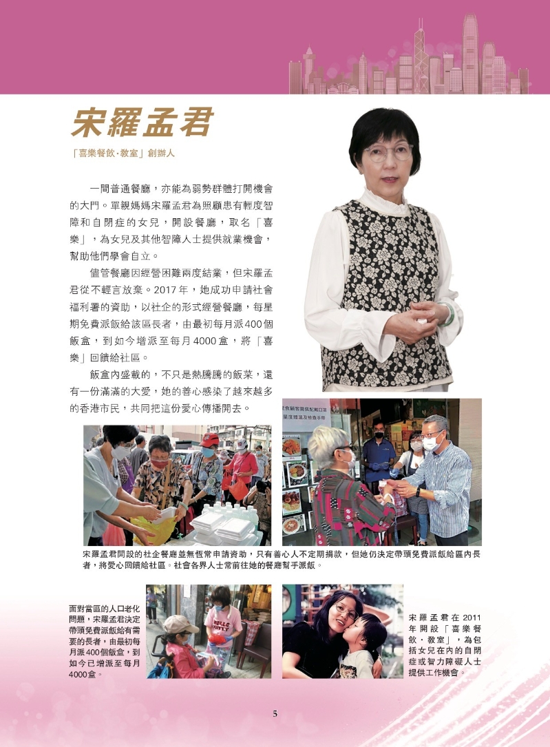 圖片來源:主辦方。 “喜樂餐飲·教室”創辦人宋羅孟君,單親媽媽的她為照顧患有輕度智力障礙和自閉症的女兒,開設餐廳,取名“喜樂”,為女兒及其他智力障礙人士提供就業機會,幫助他們學會自立,為弱勢群體打開機會的大門。