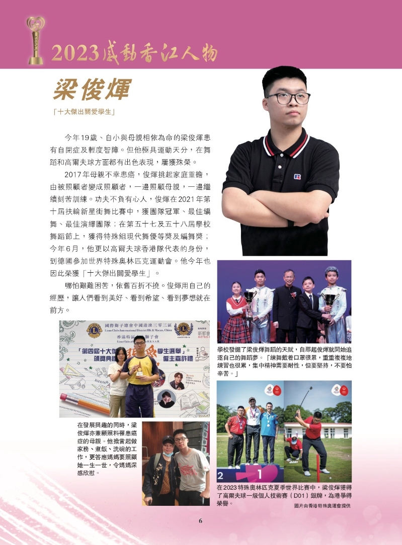 圖片來源:主辦方。 “十大傑出關愛學生”梁俊煇,今年19歲,自小與母親相依為命的梁俊煇患有自閉症及輕度智力障礙,但他極具運動天分,在舞蹈和高爾夫球方面都有出色表現。在母親不幸患癌後,俊煇更挑起家庭重擔,由被照顧者變成照顧者,一邊照顧母親,一邊繼續刻苦訓練,在國際賽事上屢屢為港爭光。