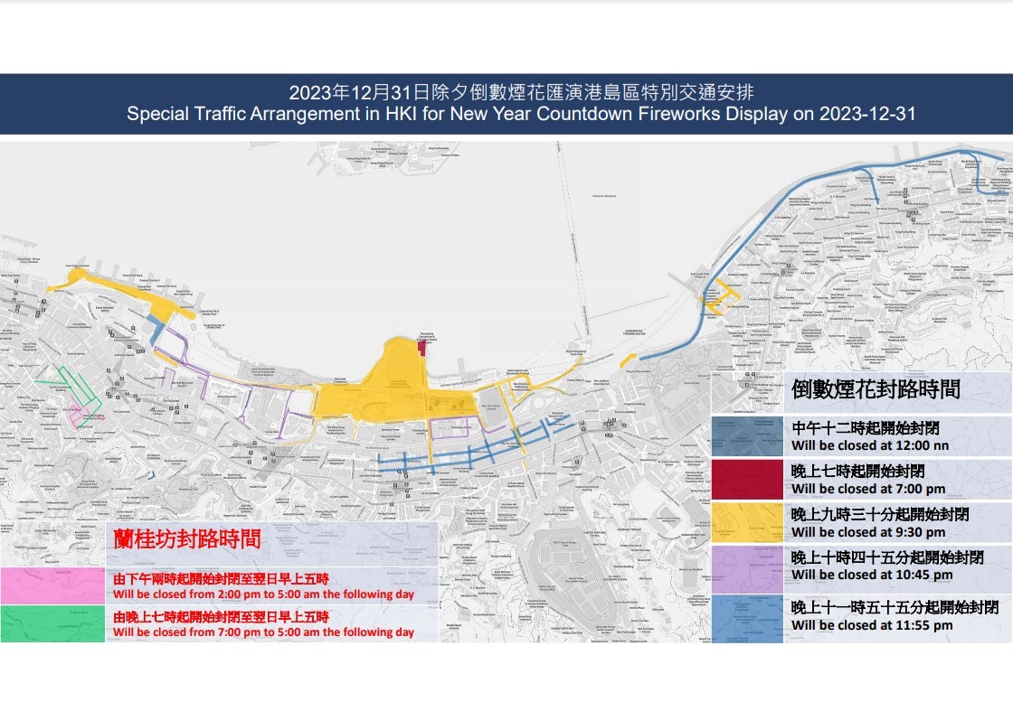 香港新聞網12月29日電 香港警方2023年12月31日至2024年1月日在港島及九龍實施特別交通安排,方便市民慶祝新年。 封路分為三個階段:第一階段(煙花匯演前)第二階段(煙花匯演期間)第三階段(煙花匯演後) 根據警方公布的除夕夜港九交通安排,西九龍當日傍晚6時起分階段封路,包括西九文化區及尖沙咀廣東道等一帶。