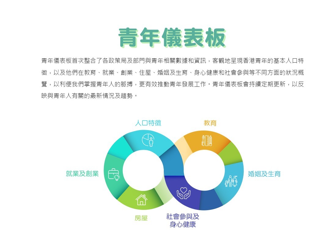 圖片來源:青年發展藍圖網站 民青局於去年底公布青年發展藍圖,當中提出會推出“儀表板”,整合青年相關數據和趨勢,以更好把握青年脈搏,推動青年發展工作。民青局隨即展開“儀表板”的籌備工作,收集由各相關政策局及部門分別備存的資料,並整合涵蓋多個與青年範疇有關的數據。為了方便用戶瀏覽,“儀表板”加入了互動數據圖表,讓用戶可靈活揀選“儀表板”上顯示的資訊或不同的數據組合。(完) 【編輯:崔靜雯】