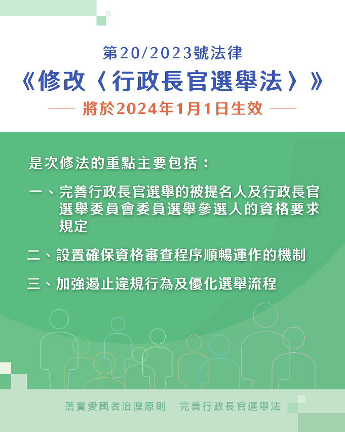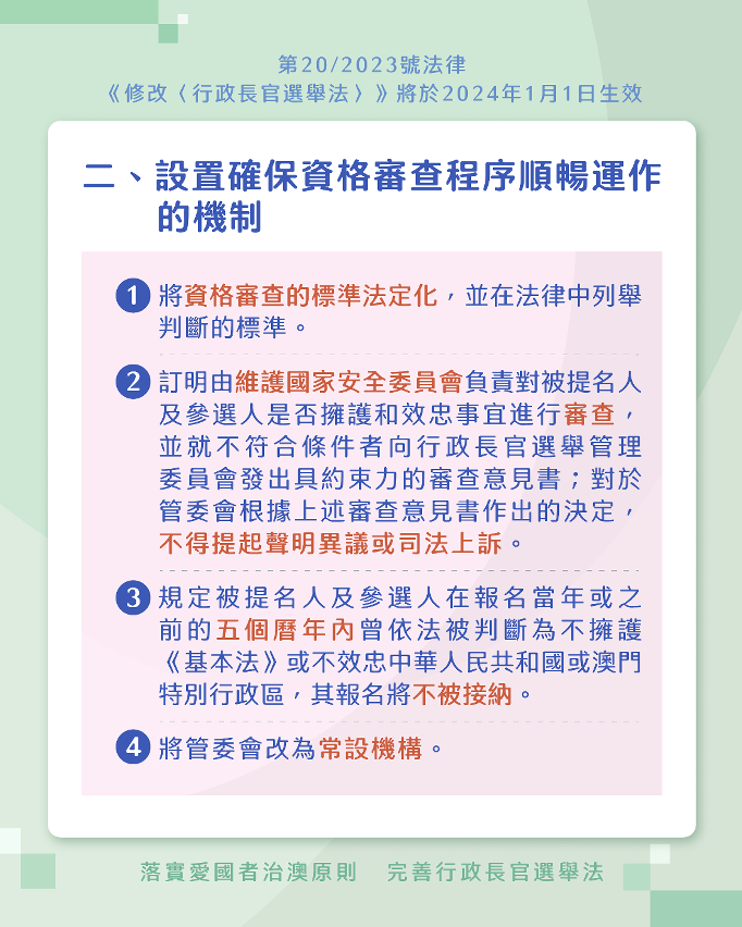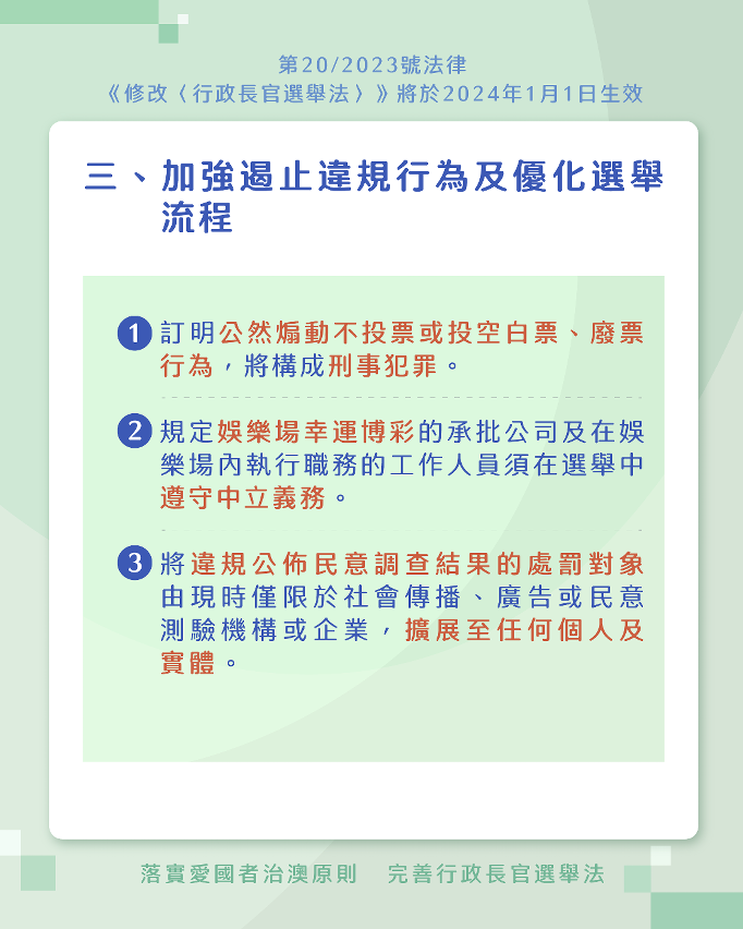圖片來源:澳門法務局 完善行政長官選舉的被提名人及行政長官選舉委員會委員選舉參選人的資格要求規定方面,新增擁護澳門基本法和效忠中華人民共和國澳門特區作為參選、出任選委會委員的資格條件;規定行政長官選舉的被提名人及選委會委員選舉的參選人,不得為外國議會或政府的成員;規定在參選時須就擁護和效忠事宜作真誠聲明,須簽署並提交聲明書,拒絕簽署聲明書者不得參選。 設置確保資格審查程序順暢運作的機制方面,將資格審查的標準法定化,列舉判斷標準,訂明由維護國家安全委員會負責就被提名人以及參選人是否擁護和效忠事宜進行審查,就不符合條件者向行政長官選舉管理委員會,發出具約束力的審查意見書;對於管委會根據審查意見書作出的決定,不得提起聲明異議或司法上訴。另外,被提名人及參選人在報名當年或之前的五個曆年內,曾依法被判斷為不擁護基本法或不效忠中華人民共和國或澳門特區,其報名將不被接納。 加強遏止違規行為及優化選舉流程方面,訂明行政長官選舉法適用於在澳門特區以外作出的部分犯罪行為,包括使用脅迫及欺詐手段影響選舉、公然煽動不投票或投空白票、廢票,以及賄選等;將違規公佈民意調查結果的處罰對象由現時僅限於社會傳播、廣告或民意測驗機構或企業,擴展至任何個人及實體等。(完)
