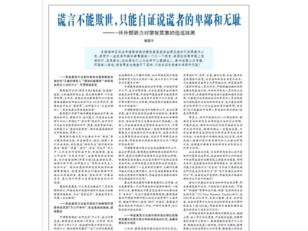 評論文章指出,那些美西方政客和媒體試圖將黎智英裝扮成“正直的媒體人”“虔誠的基督徒”“爭取自由民主人權的鬥士”,可謂荒誕至極。 黎智英所辦的《蘋果日報》靠販賣“色腥膻”起家、以製造假新聞出名,毫無媒體操守、幹盡各種壞事。多年來,該報及其他黎智英所辦刊物被香港淫褻物品審裁處依法作出100多項判罰,香港社會斥之為“毒蘋果”。他哪是什麼“正直的媒體人”,根本就是業界敗類和恥辱! 黎智英利用旗下媒體肆意製造社會矛盾、挑撥社會對立,煽動仇恨、美化暴力,而且在企業經營中與他人串謀犯下“欺詐罪”被判刑,其所作所為完全與宗教崇尚的和平、博愛、誠實背道而馳。他哪是什麼“虔誠的基督徒”,根本就是道德敗壞的奸邪惡棍、卑鄙小人! 黎智英長期為反中亂港分子和“港獨”勢力提供資金支持,并直接策劃、組織、指揮一系列非法活動,特別是在“修例風波”期間鼓吹和參與“港獨”“黑暴”“攬炒”,甘當“洋主子”的爪牙,公然乞求外國制裁中國、制裁香港,甚至公開宣稱“為美國而戰”。在香港國安法實施後,他仍繼續指揮《蘋果日報》發表煽動文章,招徠外部干預。他哪是什麼“爭取自由民主人權的鬥士”,根本就是破壞特區憲制秩序和香港繁榮穩定、損害國家根本利益和香港市民福祉的罪魁禍首,是港版“顔色革命”的幕後黑手,是勾結外部勢力危害國家安全的漢奸國賊! 文章強調,那些美西方政客和媒體不斷鼓噪所謂黎智英受到“不公平審判”,完全是裝聾賣傻、顛倒黑白。 所謂黎智英被“未審先囚”不公平,真正的事實是:黎智英先後被控4項罪名,此前因“欺詐罪”獲刑5年9個月,現在羈押屬正常服刑狀態,哪來什麼“超長期審前羈押”?當下正審的黎智英涉嫌危害國家安全罪和煽動刊物罪案件之所以一再推遲審理,是由黎智英一方刻意拖延、不斷在法律程序上糾纏而導致,如今那些美西方政客和媒體竟又想以此倒打一耙,真以為自己可以翻手為雲覆手為雨? 所謂黎智英案由指定法官審理、不設陪審團不公平,真正的事實是:對涉及國家安全的案件由指定法官審理、不設陪審團是世界多數國家和地區的共同做法,在美西方國家亦比比皆是,并不影響案件的公正審理。那些美西方政客和媒體對此不知道嗎? 所謂黎智英不被准予保釋不公平,真正的事實是:鑒於涉及國家安全案件的特殊性,香港國安法與許多國家和地區維護國家安全的法律都規定,除非法官有充足理由相信犯罪嫌疑人、被告人不會繼續實施危害國家安全的行為,不得准予保釋。而且黎智英在一度被保釋期間仍頻繁聯繫外國政客和反中亂港分子,絲毫沒有停止危害國家安全的活動,對其不予保釋完全合法合理。那些美西方政客和媒體對此沒瞭解過前因後果嗎? 所謂黎智英不被允許自由選擇律師不公平,真正的事實是:黎智英未能聘請某位英國禦用大律師,是因為該律師在香港不具全面執業資格,香港特區國安委認為其參與案件可能構成國家安全風險。此種限制是多數國家和地區的通例。黎智英已聘請了一支由資深大律師、大律師及律師組成的龐大律師團隊,其中包括在香港具有全面執業資格的外籍律師。那些美西方政客和媒體對此難道視而不見嗎? 要說有誰試圖影響黎智英案的公正審理,恰恰是黎智英一方及那些美西方政客和媒體!一段時間以來,黎智英之子黎崇恩在海外四處替他老子“告洋狀”,乞求外國插手黎智英案。黎智英拼凑的所謂國際律師團隊還使出誣告等下三濫手段,捏造所謂證人遭受“酷刑”的謠言,妄圖濫用聯合國機制干擾證人作證、干預司法程序。他們是典型的賊喊捉賊! 評論強調,那些美西方政客和媒體強拉硬扯把黎智英案說成是對言論和新聞自由的打壓,老套伎倆實在太拙劣。 幾天前,黎智英案審理的控方陳詞已完成。有關陳詞清楚表明,黎智英受審是因其涉嫌兩項勾結外國或者境外勢力危害國家安全罪,以及一項串謀刊印、發佈、出售、要約出售、分發、展示或複製煽動刊物罪,與言論和新聞自由毫無關係。正如香港特區政府多次聲明指出的,特區執法部門是針對有關人員的行為,嚴格根據證據和依照法律采取執法行動,而非針對有關人員的職業身份和背景。如果按照那些美西方政客和媒體的邏輯,只要是對具有相關身份和背景的人員采取執法行動就是打壓言論和新聞自由,豈不是說該等身份和背景可以作為違法犯罪的擋箭牌、護身符?豈不是要給予該等人員違法犯罪的特權?這是何等荒謬! 事實上,任何不抱偏見的人們都能看到,香港的言論和新聞自由得到基本法的充分保障。只要不違法,媒體評論和批評政府施政的自由并無任何限制。香港傳媒業一直蓬勃發展,目前在香港特區政府新聞處新聞發佈系統註册的本地、內地和海外傳媒機構達200多家,近年來進入香港的境外新聞媒體和從業者也有增無減,這都是對香港言論和新聞自由良好狀況的有力說明。 還應當指出的是,言論和新聞自由從來不是絕對而是有其邊界的。這在相關國際公約的規定中和世界各國的法律實踐上都是清清楚楚、明明白白的。美國最高法院也曾明確表示,當“提倡使用暴力或違法行為”的言論“目的在於煽動或造成即將發生的非法行為”并“很可能造成這樣的行為”時,這些言論不受保護。那些美西方政客和媒體對此不會不知道吧? 對那些美西方政客