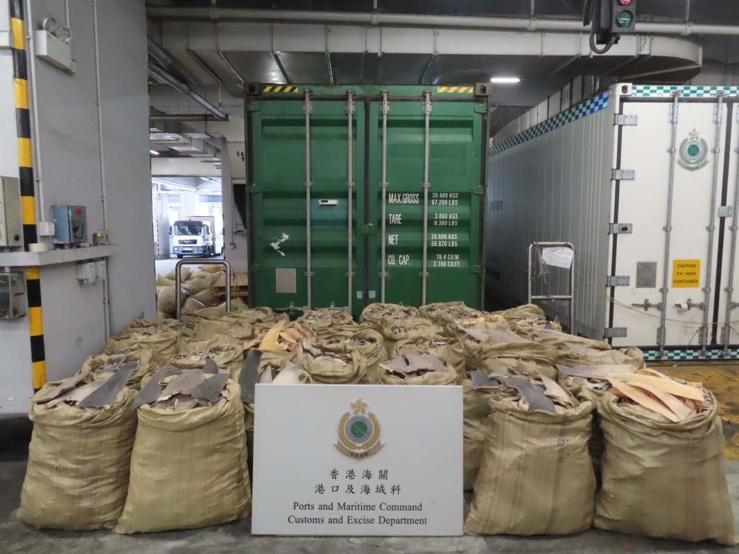 海關人員昨日透過風險評估,揀選及查驗一個從圭亞那抵港的四十呎海運貨櫃,並在貨櫃內發現該批懷疑受《保護瀕危動植物物種條例》(《條例》)(第586章)管制的乾魚翅。案件已轉交漁農自然護理署(漁護署)跟進。  (完)