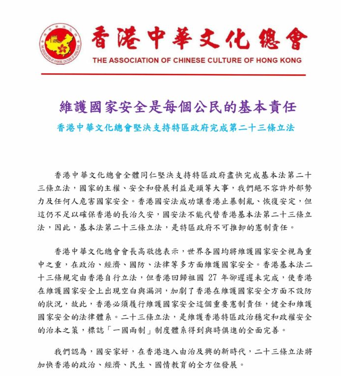 香港中華文化總會堅決支持特區政府完成第二十三條立法分享到: