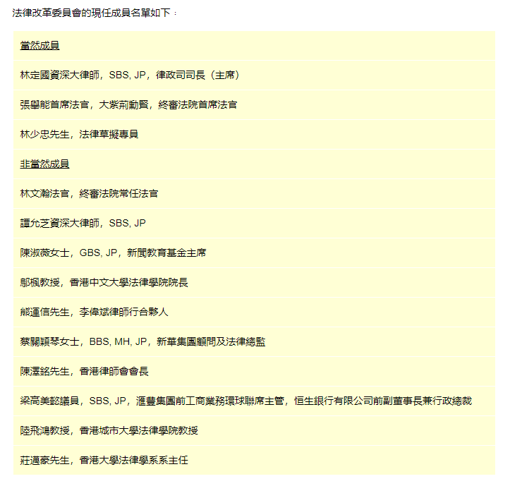 在上述最新任命後,法改會的成員名單如下︰律政司司長(主席)、終審法院首席法官(當然成員)、法律草擬專員(當然成員)、林文瀚法官、譚允芝資深大律師、陳淑薇、鄔楓教授、熊運信、蔡關穎琴、陳澤銘、梁高美懿、陸飛鴻教授、莊邁豪。(完) 【編輯:譚暢】