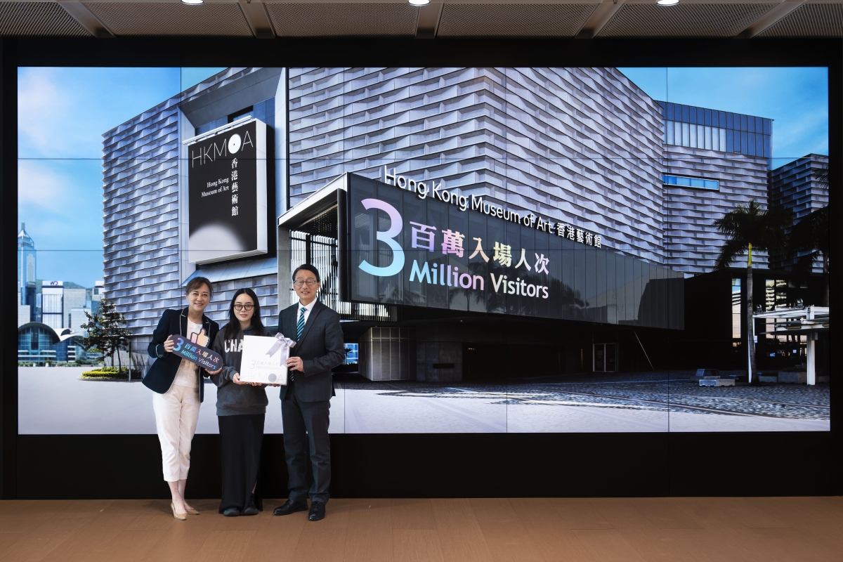 政府新聞處圖片 其中,香港藝術館自二○一九年翻新後重開以來,入場人數再創新高。藝術館本月慶祝成立62周年之際,更迎來第300萬名參觀者。二○二三年全年,藝術館共錄得超過125萬人次參觀,當中以國慶日單日錄得19 228入場人次,為全年之最。 香港文化博物館現正舉行的“絕代芳華・梅艷芳”展覽亦獲得市民支持,自去年十二月二十四日開展以來,已有10萬人次前來參觀。 康文署署長劉明光昨日(三月六日)親臨兩間博物館,在香港藝術館向第300萬名訪客送上以館藏設計的瓷碟,紀念這特別時刻。這位來自韓國首爾的旅客是首次到藝術館,總館長莫家詠博士親自為她導賞介紹展覽。 劉明光和文化博物館總館長林國輝昨日亦向“絕代芳華・梅艷芳”展覽第10萬名參觀者、來自北京的旅客張小姐送上心意紀念品,包括由梅艷芳生前好友、殿堂級時裝及形象設計師劉培基設計的紀念品、親筆簽名展覽海報和展覽明信片等。張小姐表示她成為“梅迷”已超過二十年,今次來港也特別到博物館參觀展覽懷緬這位巨星的風采。她最喜歡的展品是梅艷芳於一九九八年香港電台《第二十一屆十大中文金曲頒獎音樂會》中獲頒金針獎時穿着的服飾。