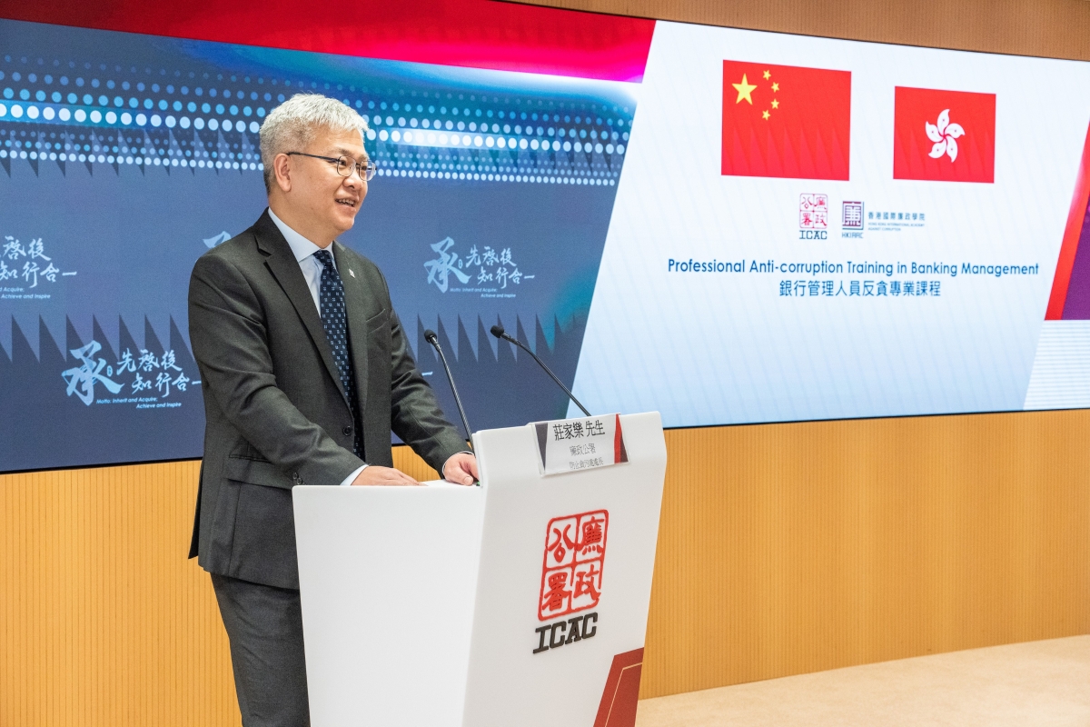 廉署圖片 廉政公署防止貪污處處長莊家樂今日(3月22日)為完成課程的銀行業界高級管理人員頒授課程證書並致辭。他十分感謝金融監督總局及香港金融管理局(金管局)對廉署工作的支持,並派員與學員分享金融監管工作的發展及經驗。 莊家樂表示:“香港作為國際金融中心,有著‘背靠祖國,聯通世界’的優勢。銀行業作為‘百業之母’,對經濟穩定發展相當重要。為了應對複雜多變的金融環境及貪污手法,廉署會繼續夥拍金管局及其他監管機構,協助銀行業持續提升防貪能力。”